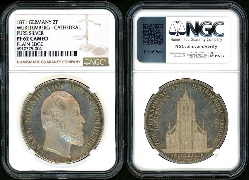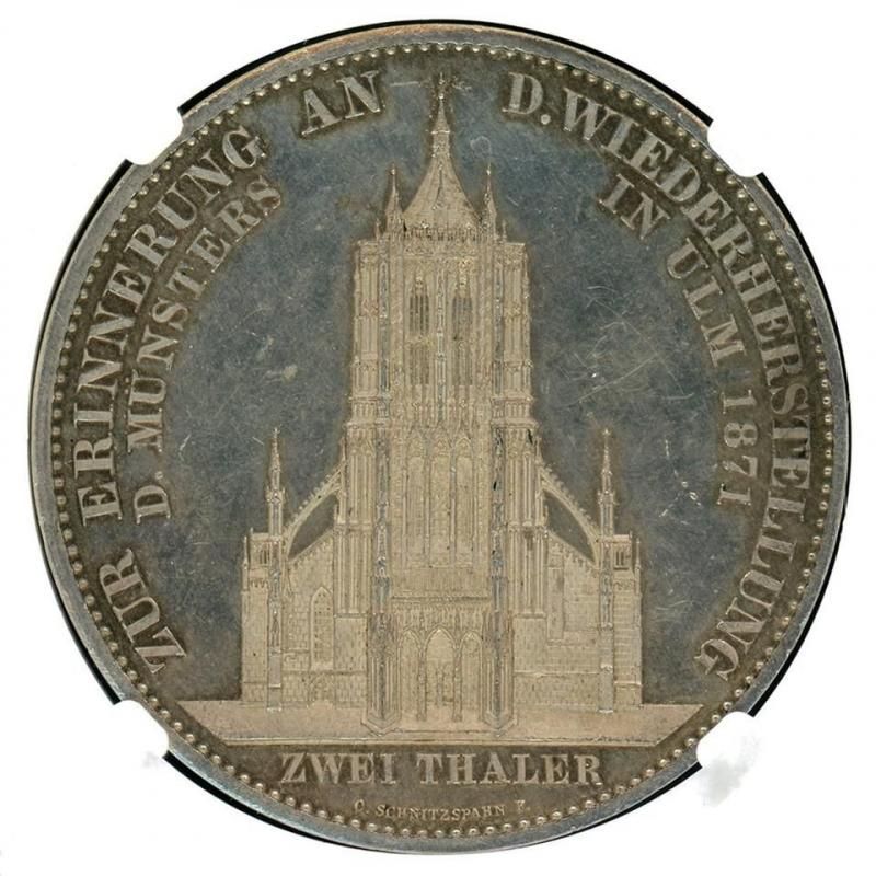 ドイツ ビュルテンベルグ 1871年 ウルム寺院 2taler PURE SILVER PF62CAM